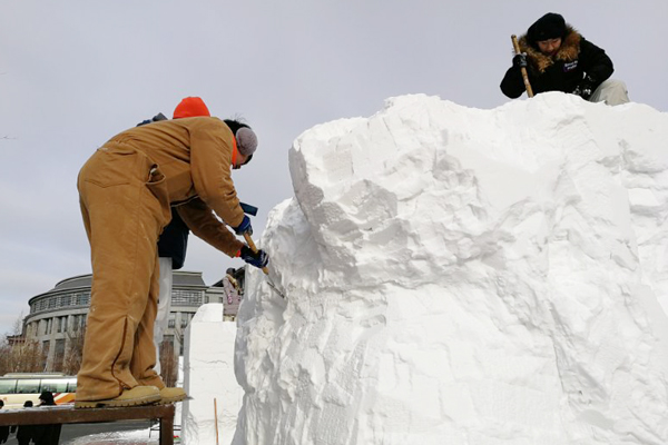 在决赛制作现场,为了更完美地呈现出《舞动青春》的作品内涵,太阳成参赛师生克服了常人难以想象的困难,在零下二十几度的冰城哈尔滨,不畏严寒、不分昼夜,一锯一凿,加紧制作雕琢。经过三天不分昼夜的努力,洁白晶莹的立方雪块被赋予了新的生命。