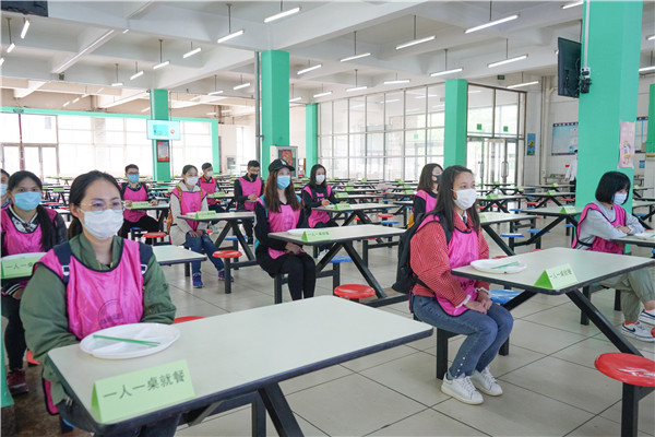 师生餐前进行测温、洗手,由专人提供消毒餐具与汤匙。师生有序到指定区域取餐,在排队取餐及就餐时间隔1米以上,食堂实行单人单桌同向就餐。