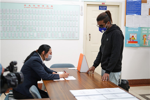 留学生经过返校报到登记后,间隔1米到公寓前台办理入住,登记分配房间。工作人员讲解留学生公寓管理规定,引领至指定房间。