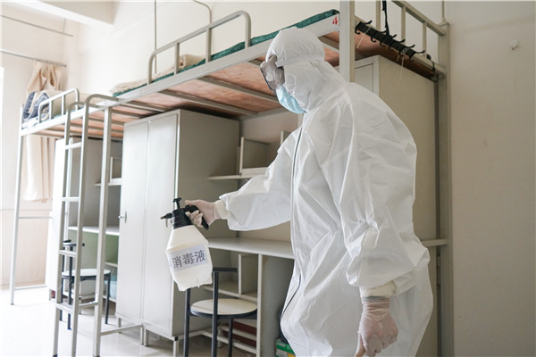 七公寓内,学生转运后,校医护人员和保洁员根据规定要求详细做好消毒杀菌,并进行通风,做好消杀记录。