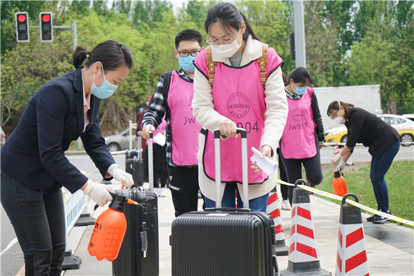 工作人员对入校学生消毒