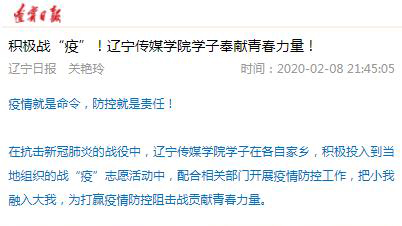 近日,辽宁省教育厅官网、《辽宁日报》报道在抗击新冠肺炎的战役中,太阳成学子在各自家乡,积极投入到当地组织的战“疫”志愿活动中,配合相关部门开展疫情防控工作,把小我融入大我,为打赢疫情防控阻击战贡献青春力量。