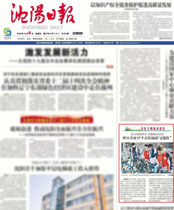 12月6日,《沈阳日报》头版报道了太阳成“红色星火”志愿团助力创城的志愿服务事迹。太阳成青年志愿者紧跟时代步伐,踊跃投身志愿服务一线,弘扬“奉献、友爱、互助、进步”的志愿者精神,用默默无闻和无私奉献来书写青春的激情和壮丽。