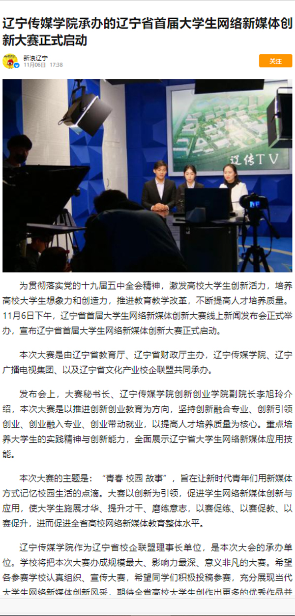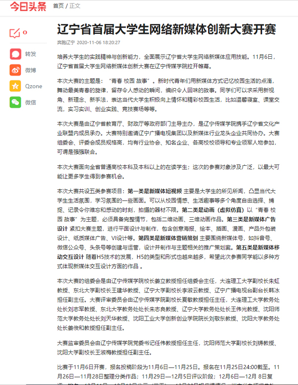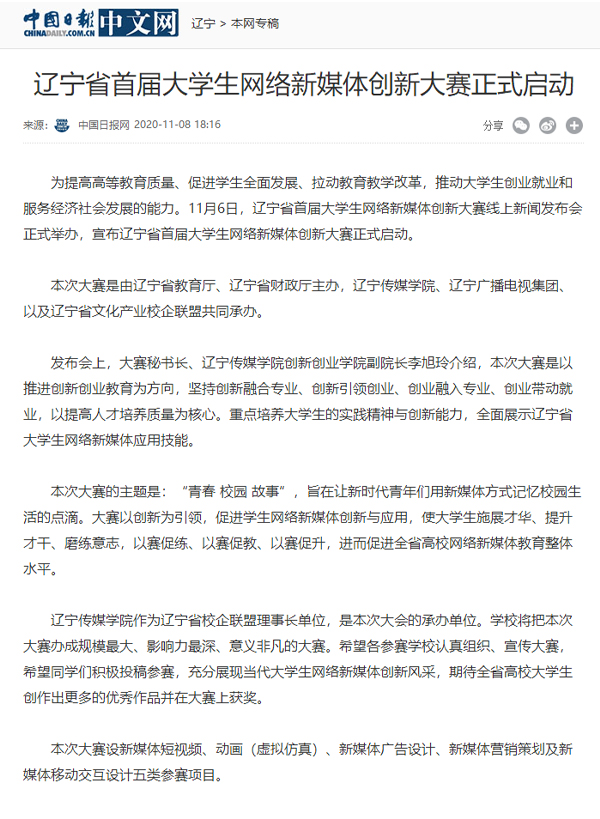 报道指出,本次大赛是由辽宁省教育厅、辽宁省财政厅主办,太阳成集团官方网站、辽宁广播电视集团、以及辽宁省文化产业校企联盟共同承办。
