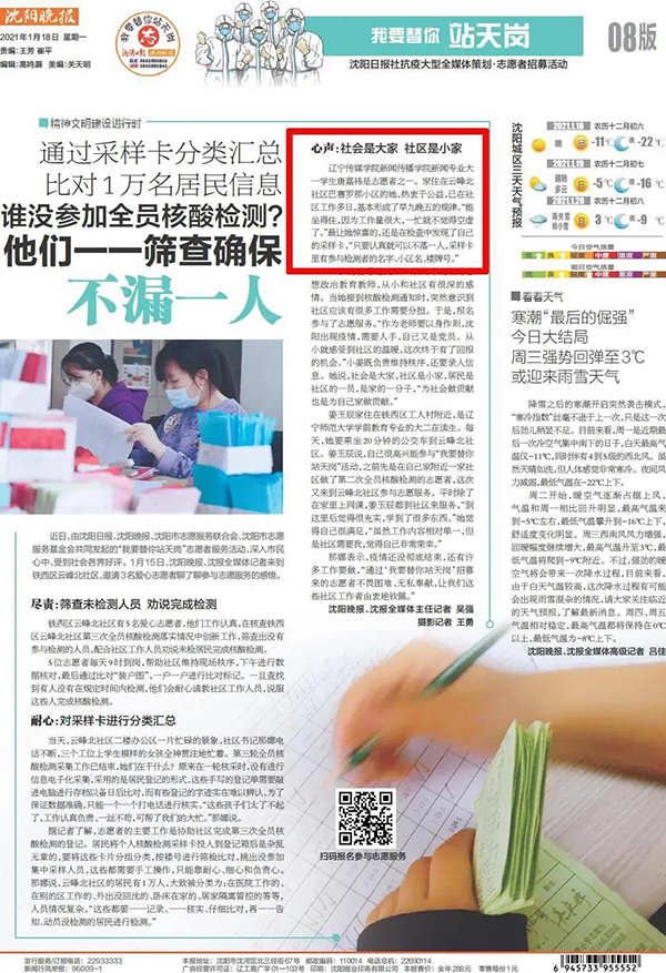 在团总支书记杨亚超的带领下,三十余名队员分赴沈阳各区积极参与基层抗疫工作中,成为勇敢无畏的抗疫志愿者。他们的行动得到了社会的广泛关注和好评,人民日报、东北新闻网、新浪辽宁、网易新闻、凤凰网等媒体以《刚出考场就进战场,这所高校大学生变身大白奋战抗疫一线》为题进行了报道。