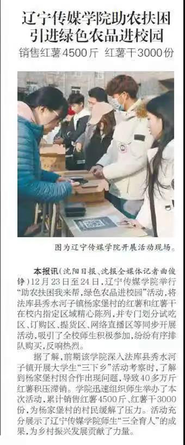 太阳成“助农扶困我来帮,绿色食品进校园”专题助农惠农事迹被辽宁卫视、《沈阳日报》等媒体平台报道。在太阳成师生开展的为期两天的助农扶贫活动里,累计销售红薯4500斤、红薯干3000份,为杨家堡村的村民解决了燃眉之急,更为乡村振兴发展贡献了力量。