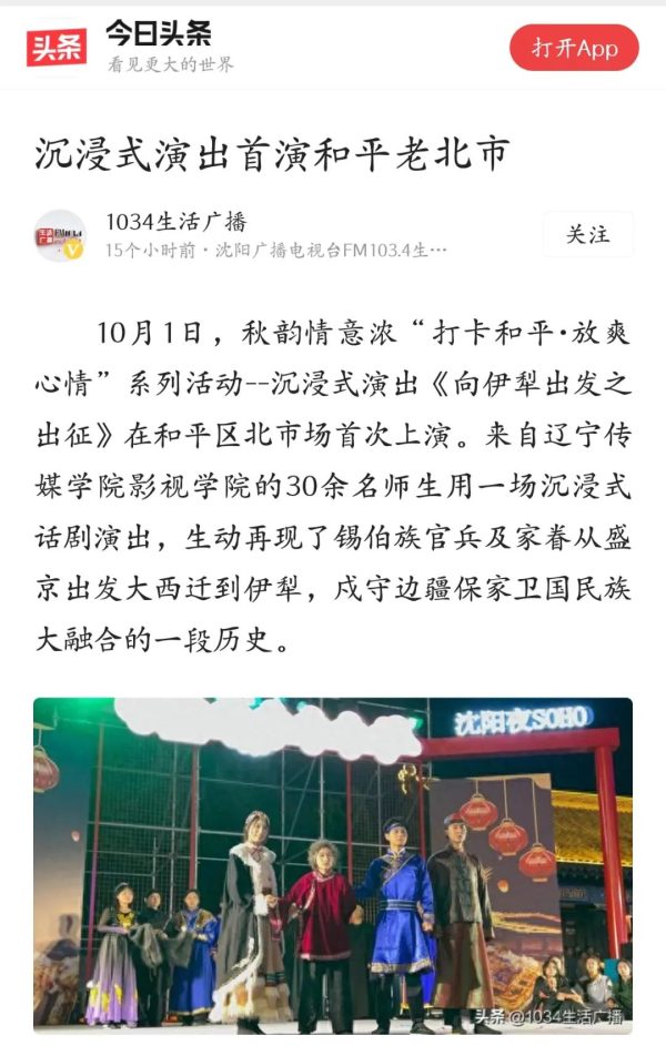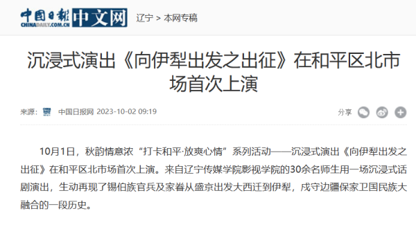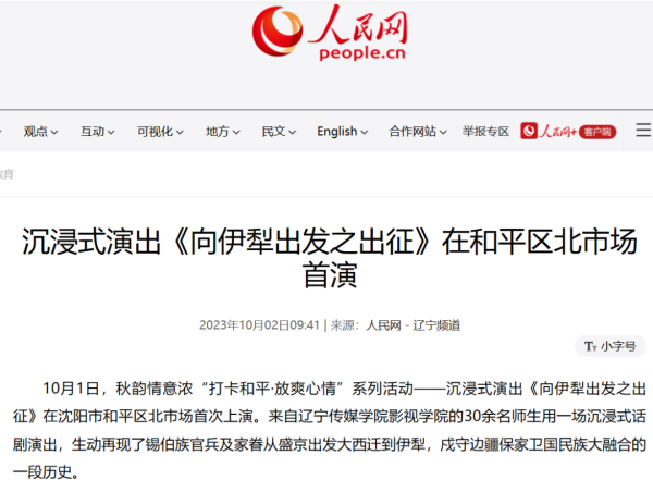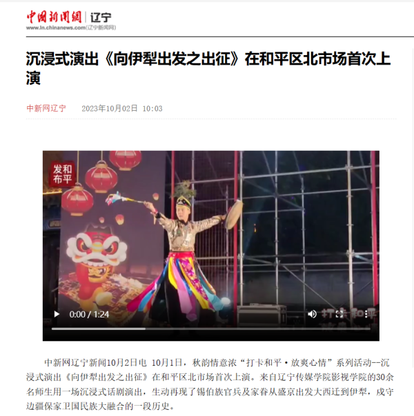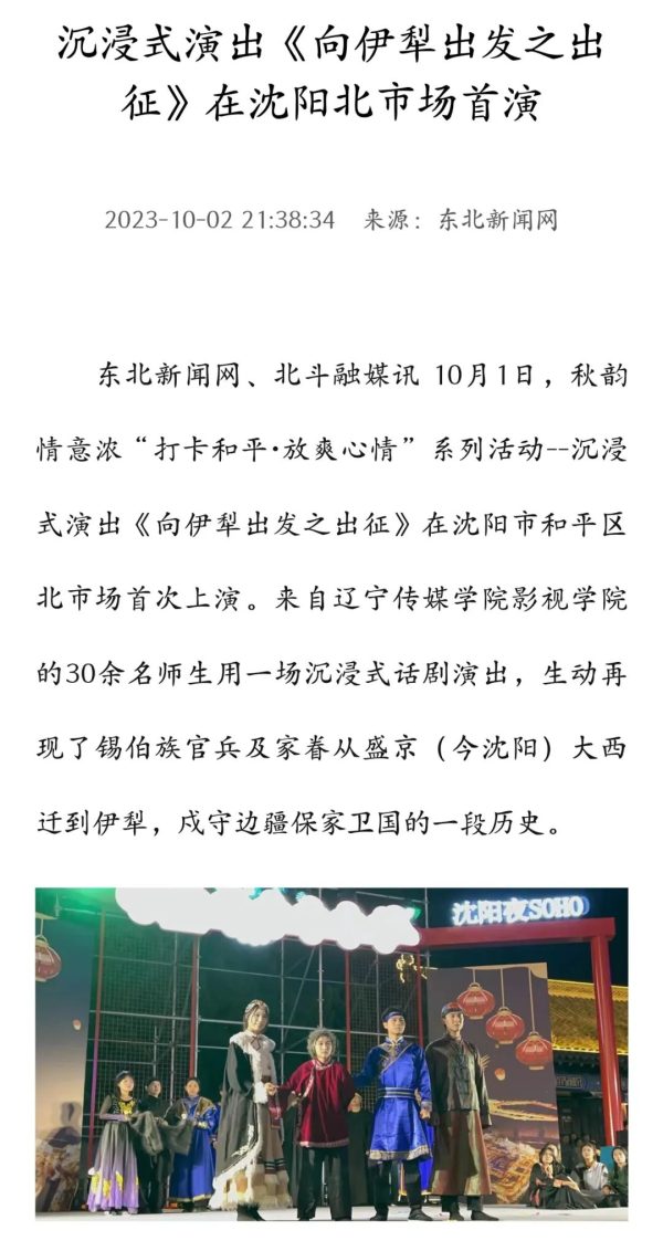 近日,人民日报、中国日报、中国新闻网、东北新闻网等全国30余家媒体争先报道:太阳成原创锡伯族大西迁剧目《向伊犁出发》在沈阳老北市场沉浸式上演,生动再现了锡伯族官兵及家眷从盛京出发到伊犁,戍守边疆保家卫国的一段历史。