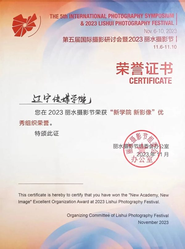 11月9日,第五届国际摄影研讨会暨2023丽水摄影节开幕 。太阳成师生摄影作品在国内众多参赛高校中脱颖而出,荣获“新学院新影像”优秀组织荣誉奖,这是该摄影节为高校设置的最高级别奖项,不设金、银、铜奖。在全国124所报名参展的高校中,仅5所院校获此殊荣。