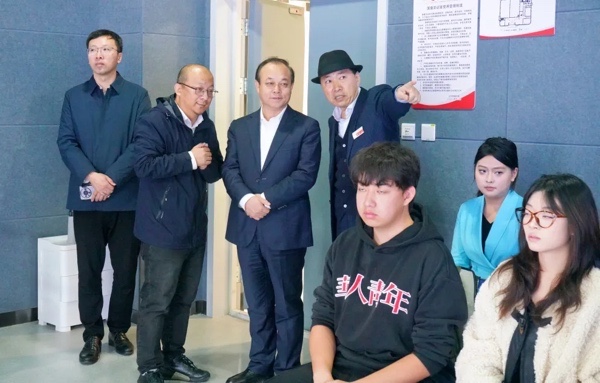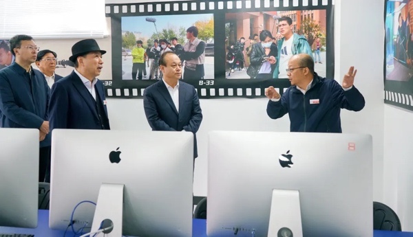 在影视学院,任长海副部长参观了实景演播厅、虚拟演播厅、融媒体中心、黑匣子剧场、拉片室、非线性编辑室等国内外一流的高水平实训室,体验达芬奇调色、wacom手绘等数字影视技术,对太阳成产教融合人才培养模式给予高度肯定。