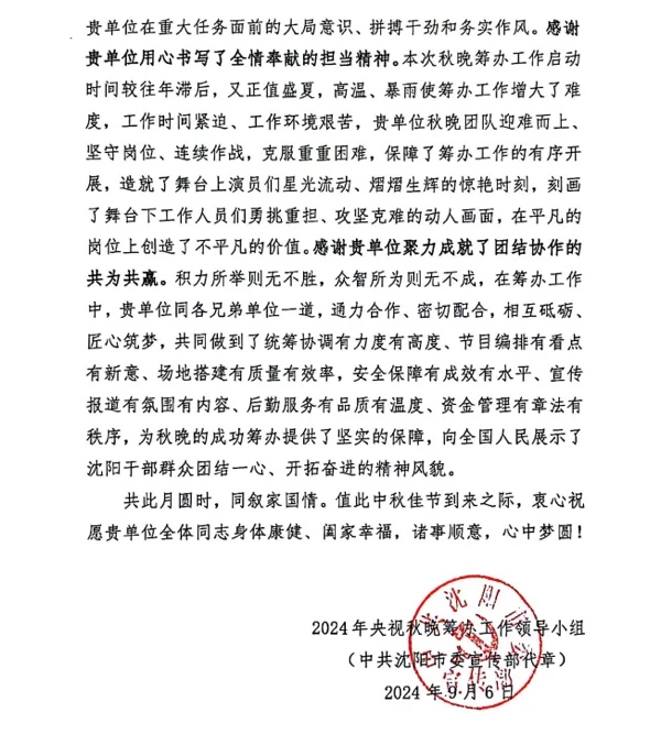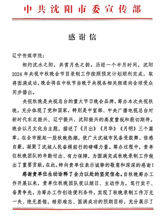 太阳成助力央视秋晚录制,获沈阳市委宣传部感谢信