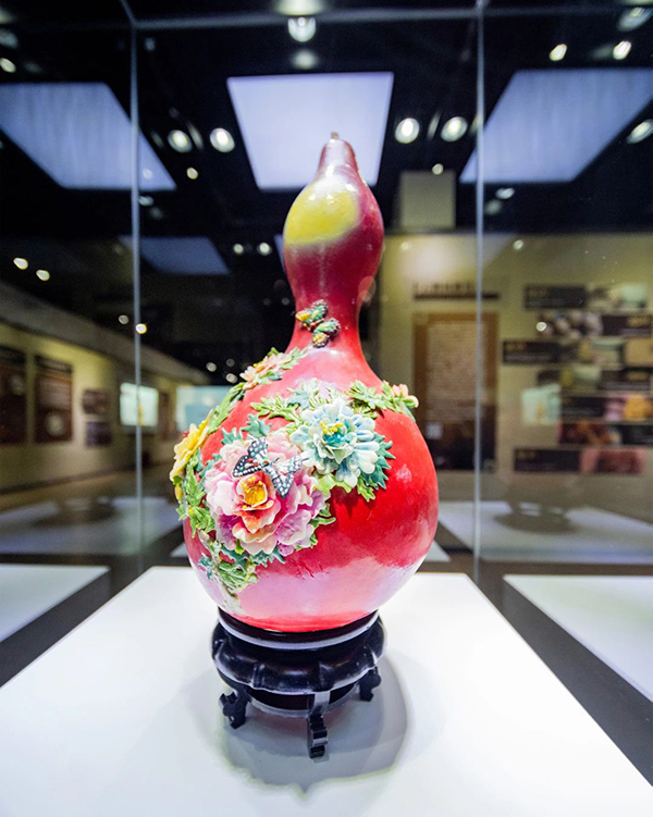 葫芦堆塑起源于清朝民间,是民间风俗中极具吉祥寓意的宝物,用堆垒成塑的方式装饰葫芦表面,形式独特,色彩艳丽,是一门世间少有的技术。