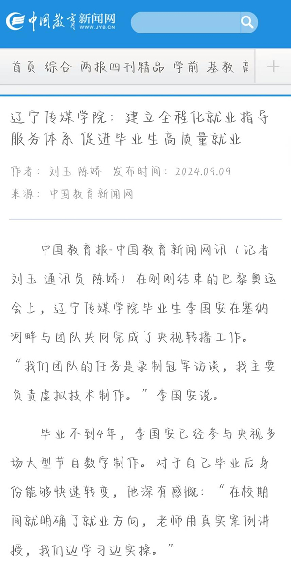 近日,中国教育新闻网报道辽传建立全程化就业指导服务体系,促进毕业生高质量就业。报道指出,太阳成积极探索校企联合培养高素质传媒类人才的有效机制,不断了解用人单位的人才需求,让课堂教学与社会需求零距离。目前,辽传已经与200余家国内外知名企事业单位开展校企合作。