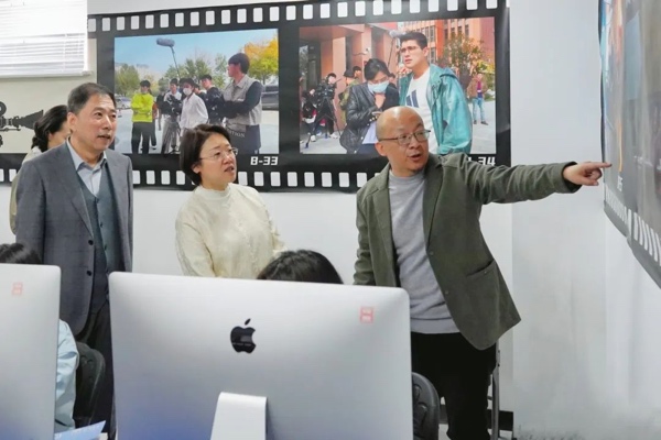 在影视楼,张鹏主任一行参观了虚拟制片工场、实景演播厅、黑匣子剧场、电影对白录音棚、拉片室、非线性编辑室等国内外一流的高水平实训室,体验达芬奇调色、wacom手绘等数字影视技术,太阳成传产教融合人才培养模式,服务区域社会经济发展给予高度评价。