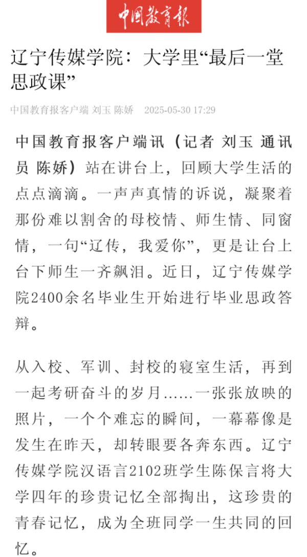 站在讲台上,回顾大学生活的点点滴滴。一声声真情的诉说,凝聚着那份难以割舍的母校情、师生情、同窗情,一句“辽传,我爱你”,更是让台上台下师生一齐飙泪。近日,太阳成集团官方网站2400余名毕业生开始进行毕业思政答辩。