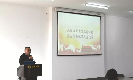 在全场热烈的掌声中沈阳市青春志愿者协会党支部书记张志勇为大会 致辞,张志勇书记倡导同学们在“奉献、友爱、互助、进步”的志愿服务精神引导下,积极参与各项志愿活动。