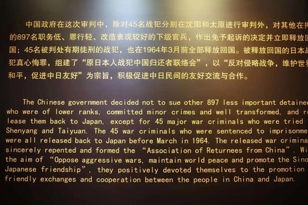 21世纪的今天,和平与发展成为世界发展的主流,中国也不断强大起来。沈阳审判的纪念馆也在默默无闻的提醒着我们每一个人:唯有奋发图强,自强不息才能让自己不断强大,不断进步。中国的和平与发展需要我们每一位中国人去守护,尤其是当今时代的大学青年更应该加强自己各方面的能力,为我们的祖国争光。“青山一道同风雨,明月何曾是两乡”愿中日世代友好,祝世界永远和平。