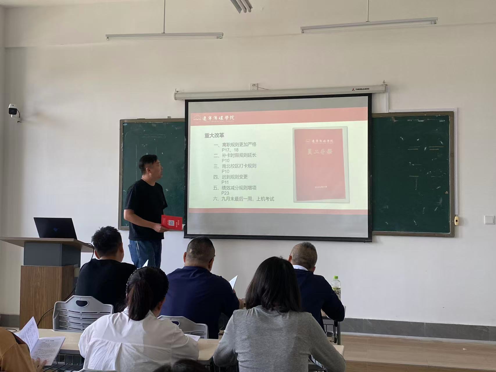 会上,李刚主任以专业且细致的讲解,剖析了新一版员工手册的重大改革要点。新手册紧密贴合学院发展战略,在教学管理、教师职责、团队协作等方面进行了优化升级,旨在为日常教学与管理工作提供更为科学、高效的行动指南,助力提升整体教学服务品质。会议督促全体教师将手册内容内化于心、外化于行,确保各项规章制度精准落地。