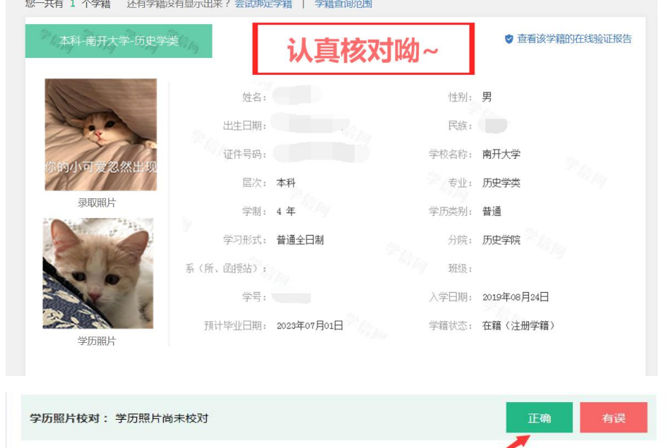 注:因照片还将用于学位网及学校其他部门,所以只有照片不是本人、倒立、头发盖眼、没有显示完整,方可点击有误,如不好看、想重新拍等,均不得点“有误”,也不得自己联系图片社更改学信网照片,以免学校手里的照片与学位网的不符,导致证书被怀疑造假。