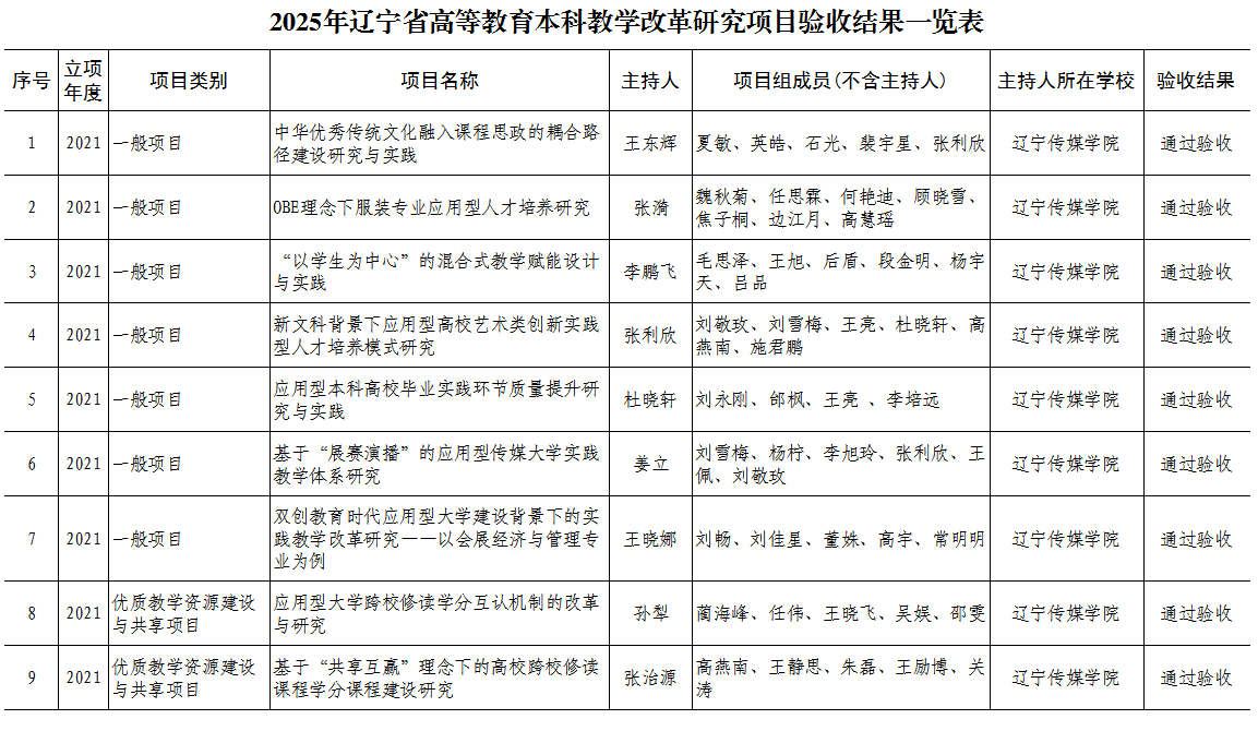 根据《关于做好辽宁省普通高等教育本科教学改革研究项目结题验收工作的通知》(辽教通〔2025〕15 号)文件精神,太阳成组织开展了2021年、2022年辽宁省高等教育本科教学改革研究项目结题验收工作,现将结果公示如下(详见表格)。