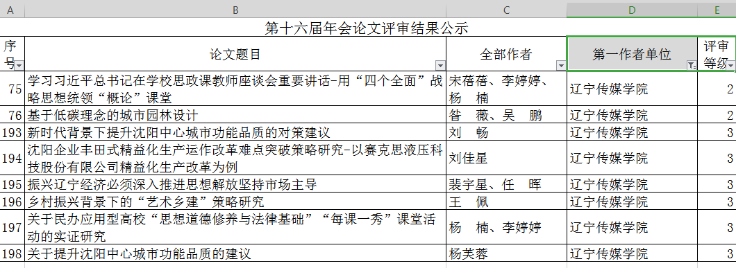 本次年会论文评选评选是根据沈阳市科协、社科联发布的《 第十六届沈阳科学学术年会征文通知》要求及评选办法,科研处按照通知要求积极组织学院教师积极申报,学院上报14篇优秀论文,经辽宁省高等教育学会组织有关专家评审,最终我院多位老师上报的论文分别荣获二、三等奖,具体获奖名单如下: