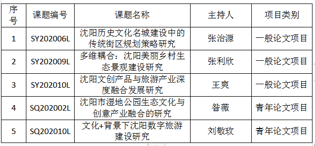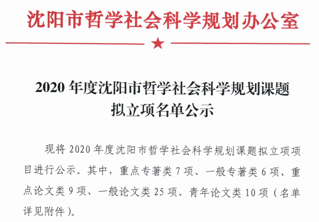2020年9月18日,沈阳市哲学社会科学规划基金办公室公布2020年度沈阳市哲学社会科学规划课题立项名单。