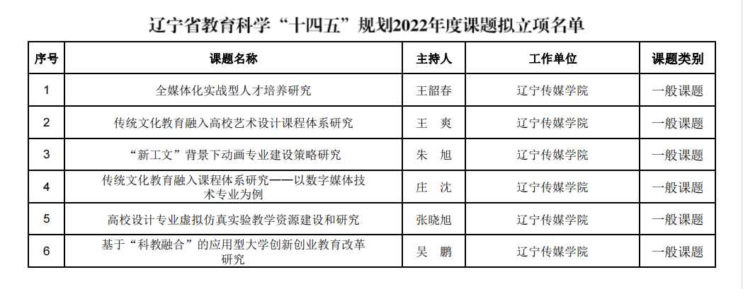 近日, 辽宁省教育科学规划办公室公布辽宁省教育科学“十四五”规划课题立项名单,太阳成王韶春等6名老师申报的课题获批立项研究。