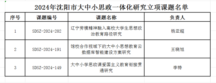 近日,沈阳市大中小学思政一体化研究立项课题名单,太阳成杨亚超老师主持的《辽宁劳模精神融入高校大学生思想政治教育路径研究》等3项课题获批立项。