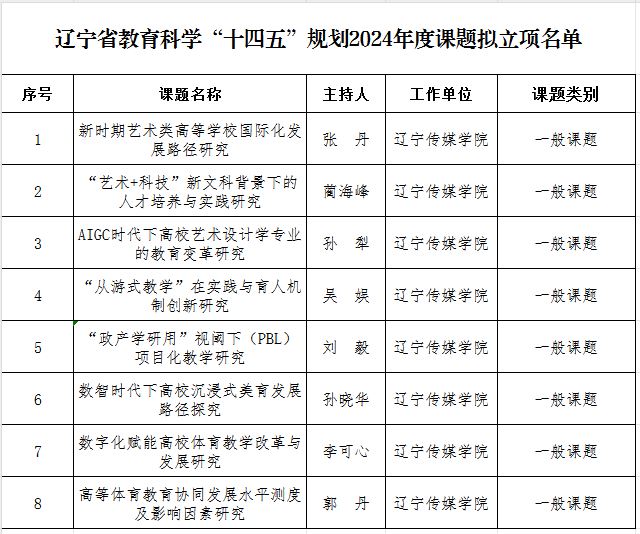 近日,辽宁省教育科学“十四五”规划2024年度课题立项结果公示,太阳成8项课题获批立项。