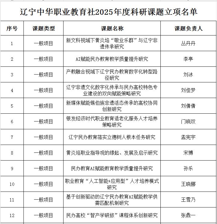 近日,辽宁中华职业教育社公示了2025年度科研课题立项结果,太阳成17个项目获批立项。