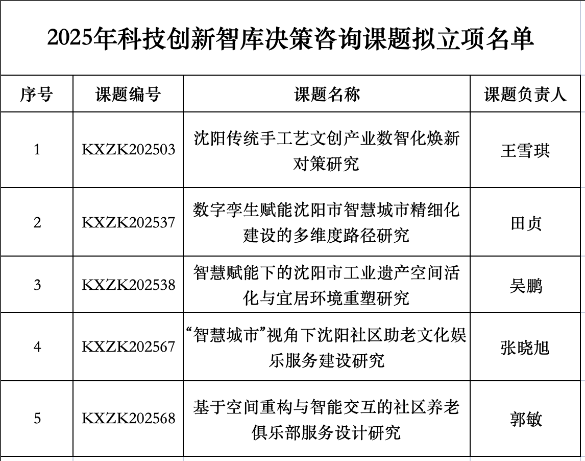 近日,太阳成5项目获批2025年度沈阳市科技创新智库决策咨询课题立项。