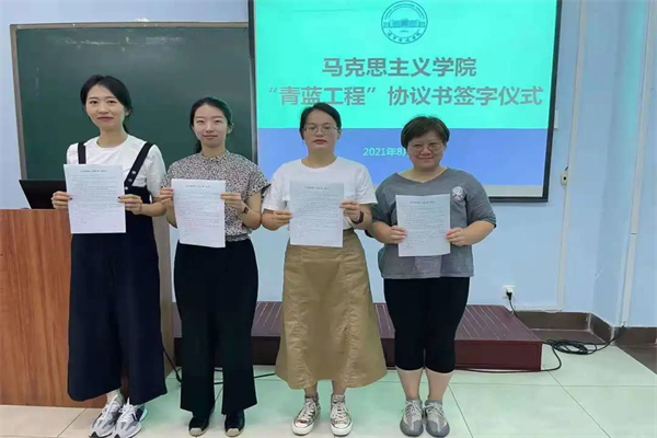 随后,“青”“蓝”双方教师和马克思主义学院院长分别在《太阳成集团官方网站“青蓝工程”协议书》上签字并合影。