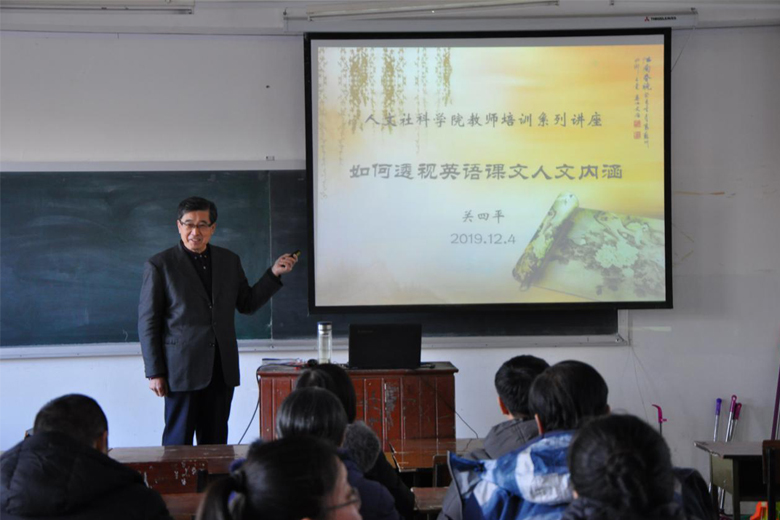 2019年12月4日下午,人文社科学院成功召开了教师培训大会。培训的内容是:《如何透视英语课文人文内涵》,培训由人文社科学院院长关四平教授主讲,全体教师都参加了这次培训。