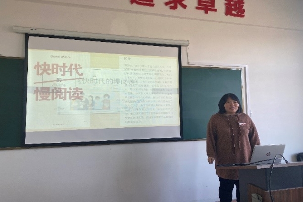第二位发言的是中文系王娜老师。王老师分享的书籍是《快时代慢阅读》。王老师说诚如书名所言,希望我们一起用慢阅读来抵挡互联网时代的碎片化和娱乐化,重新建立起人与文学阅读之乐的古老联系。这本书的价值点,不仅在于作者为我们剖析了时代的弊病,还用自己丰富的文学教授的经验,为读者们提供了十四条阅读规则和五种文体的阅读示范,帮助我们获得更为丰盛和透彻的阅读体验。可以说,这本书就是浮躁社会的一剂清凉贴,可以让我们在互联网时代重新收获阅读的快乐。