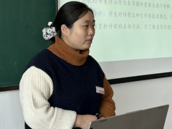 第一个环节是教师说课、讲课,由新教师杨晓霜、刘菲菲和赵润汐主讲。第一位上台的是杨晓霜老师。她说课和讲课的内容包括教学分析和教学设计。教学分析涉及内容分析、教学的重难点和学情分析。讲授课程为大学写作,主要讲诗歌的界定、分类、审美特征及写作方法。重难点是诗歌的审美特征。作业是以艾青的《我爱的土地》为例,让学生赏析现代诗的审美特征。