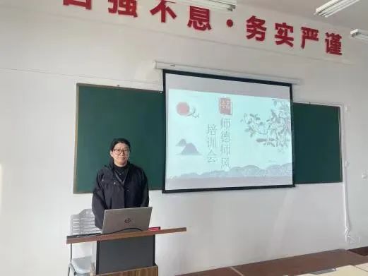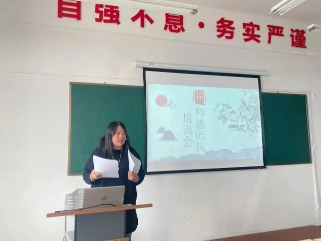 接下来三位教师代表谈及师德师风建设的感想。李菲菲老师在对师德的解释中,讲到有一句;师爱为魂。“师爱”是教师对学生无私的爱,它是师德的核心,即“师魂”。以案例来说明我对“师爱为魂”的践行。在教学中遇到过一位学生,家境贫寒,其父亲突发疾病。在发现他的求助后,果断捐助并转发以解决他眼前的困难。后来听说学生家长恢复的不错,而本人也因为尽了绵薄之力而感动快乐。