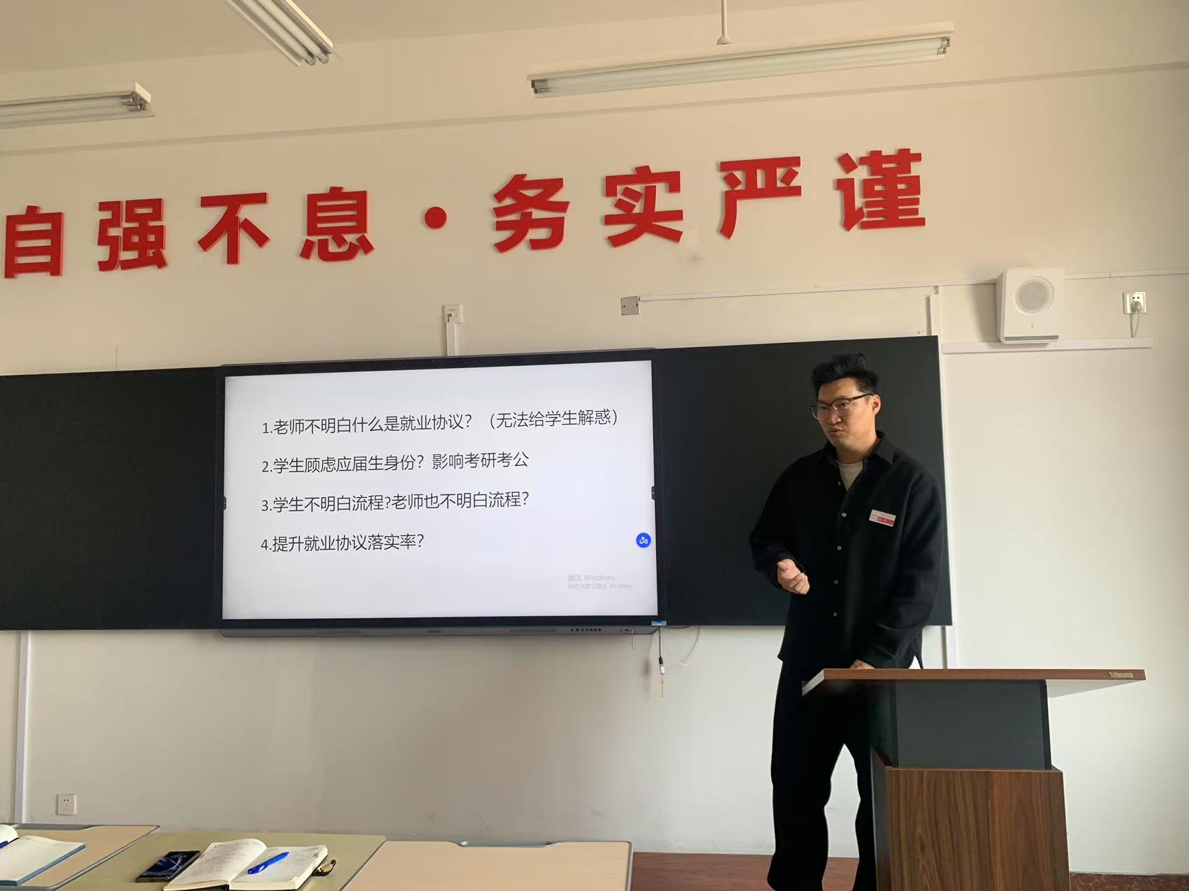 孙犁主任则从学院层面出发,强调了加强就业指导服务的重要性,认为各学院应不断提高指导服务的精细度和岗位供需匹配的精准度,切实提升毕业生的就业能力,建议建立二级学院实习就业工作定期汇报制度,加强部门间的沟通与协作。