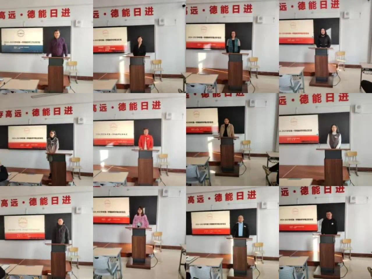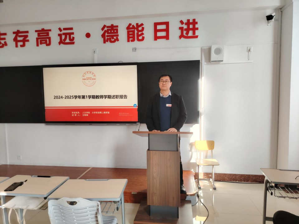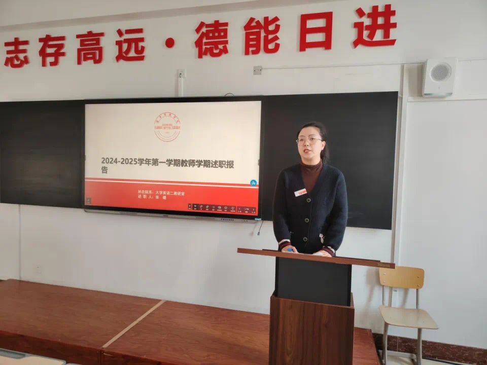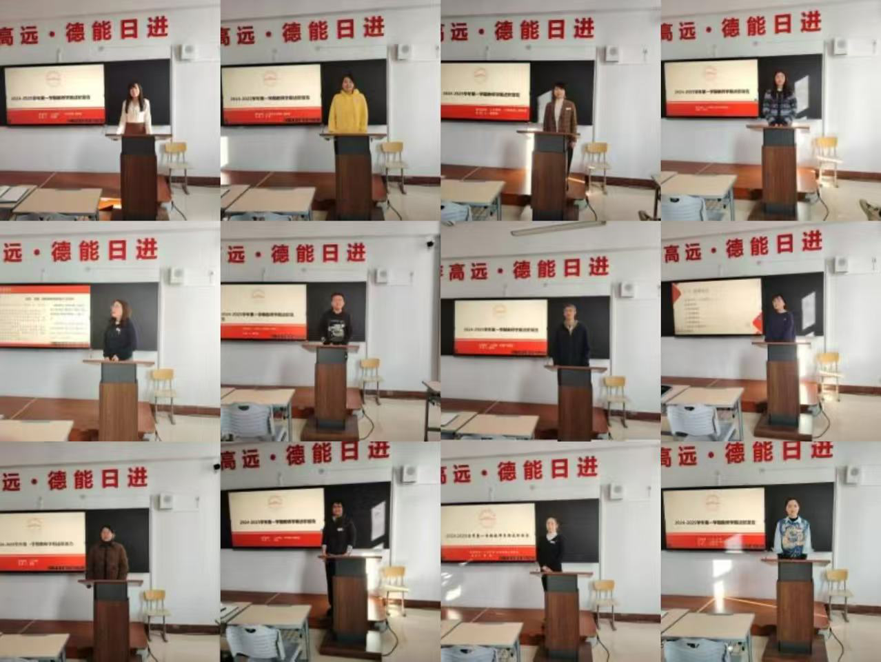 教师述职开始,人文学院的教师们逐一进行述职,分别从教学工作、内涵建设、其他工作、存在问题、改进措施五个主要方面展开。述职的每一位教师都精神饱满,展示出自己的亮点、创新点,同时也能正视自己目前工作中的不足,积极寻找解决方法和措施。期末教师述职大会不仅是教师个人总结和展示的平台,更是学院沟通、发展和优化的关键环节。它对于促进教师个人成长、加强教师协作、明确教学和科研目标、激发教师的工作潜能以及推动学院整体发展都具有不可替代的重要意义。