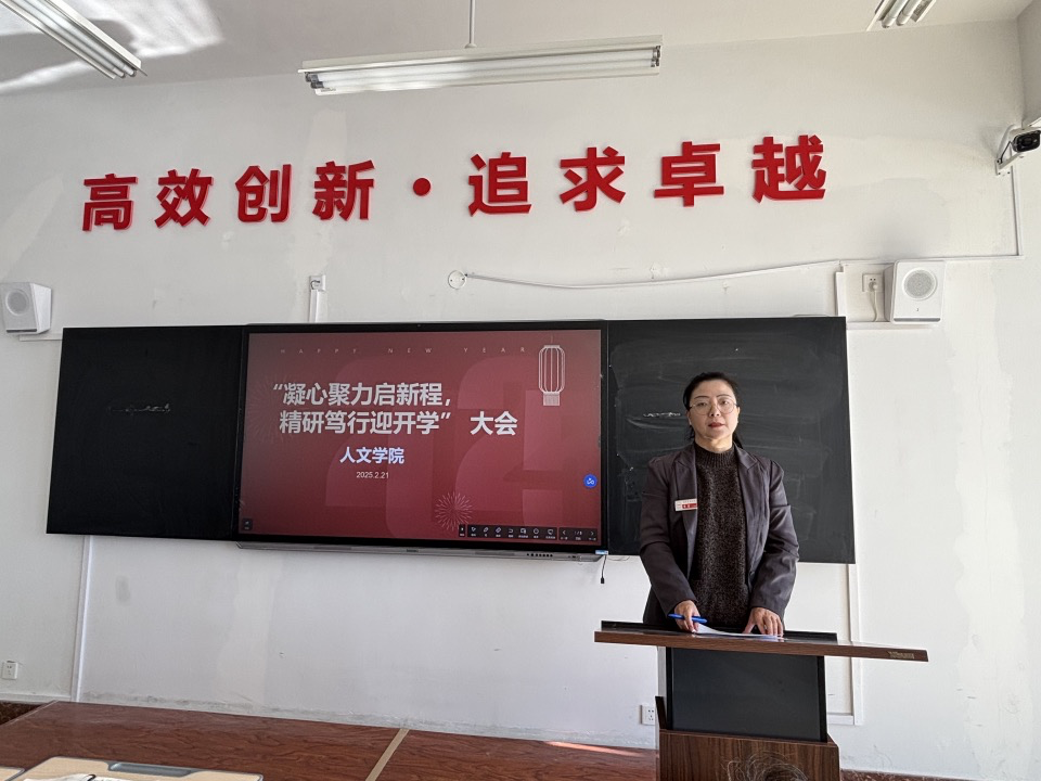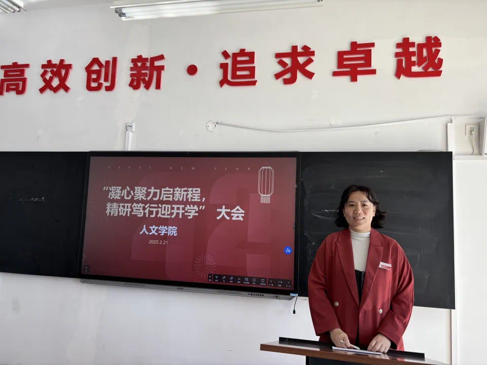 本次大会以“凝心聚力启新程,精研笃行迎开学”为主题,旨在统一思想、明确目标、振奋精神,为新学期的各项工作奠定坚实基础。人文学院主持工作副院长、党总支书记吕元、副院长李晶、大学英语教研室主任武芳和许佳欢、中文系主任赵润汐以及全体教师参加了会议。
