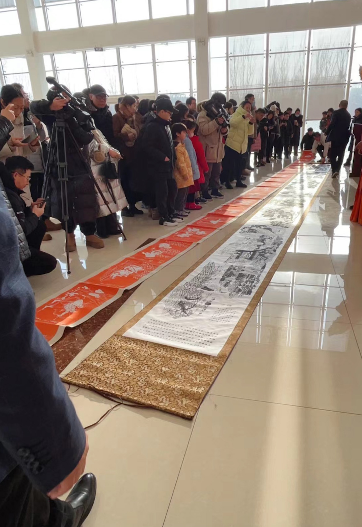 藏品揭幕环节中,国家非物质文化遗产锡伯族民间故事第三代传承人、非遗馆馆长王东辉教授身着一袭靓丽的锡伯族喜利妈妈服饰,与同样穿着锡伯族民族服饰的李英杰先生联合沈北新区宣传部曹部长,一同展示了《富春山居图与群鱼地图双面屏风》和《喜利妈妈的传说》剪纸长卷。当三位出场,缓缓展开14米长的喜利妈妈长卷和12米长的红楼梦长卷的时候,全场沸腾。这些作品犹如一条璀璨的文化长河,流淌着锡伯族深厚的民间文化底蕴,和中国古典文学的意境之美。观众们惊叹于老先生的精湛技艺,更被这一文化传承的壮丽景象所深深感染。