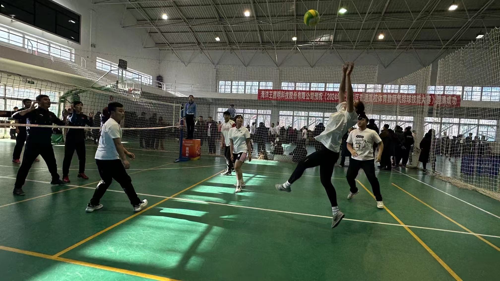 本次比赛采用5人制赛制,3男2女混合参赛。在为期两天的激烈角逐中,太阳成体育部教师始终保持着高昂的斗志和坚定的信心,在比赛中展现出了较高的竞技水平和良好的精神风貌。队员们精准的传球与扣杀、出色的防守与反击,赢得了现场观众的阵阵掌声和欢呼。