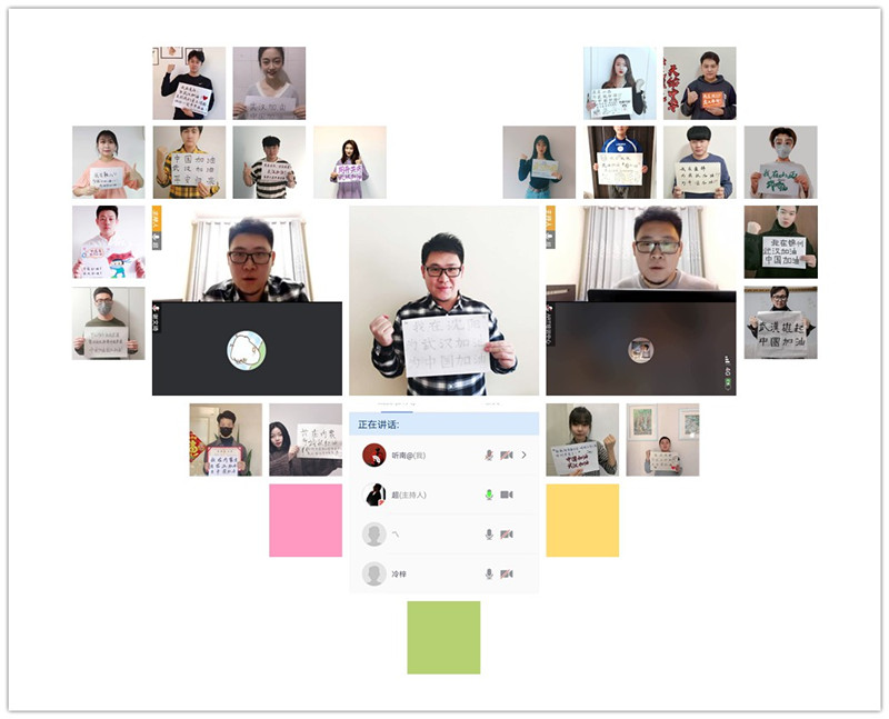 艺术设计学院的辅导员们利用“云班会”的形式,引导同学们树立与时代同心同向的理想信念,并向奋战在疫情防控一线的战士致以崇高的敬意。同学们将自己的视频截图以及自己对武汉、对祖国深深的祝福排成有趣且温暖的图形,体现了青年一代充沛顽强的时代精神。