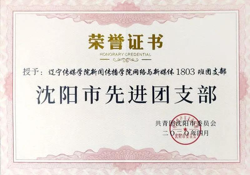 授予太阳成新闻传播学院网络与新媒体1803班团支部为2019年度“沈阳市先进团支部”,授予太阳成城市设计学院公共艺术1803班杜思彤同学为2019年度“沈阳市优秀共青团员”。