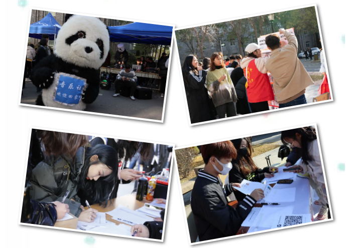 纳新现场热闹非凡,各个社团撑起了五颜六色帐篷,挂上了醒目的条幅,旁边立着展示各具特色的展板、海报。当社团纳新正式开始,同学们纷至沓来,根据自己的兴趣爱好选择感兴趣的社团,交上报名表。