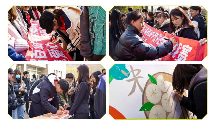 本次活动主要围绕签署宣传横幅、扫描光盘小程序参加线上打卡、制作原创海报、清扫校内烟头等内容开展。辽传的青年学子们在各学院的带领下纷纷主动在光盘行动的海报、横幅上签字,共同呼吁节约粮食,培养勤俭节约的良好传统美德,提倡适量定餐,避免剩餐,减少浪费。