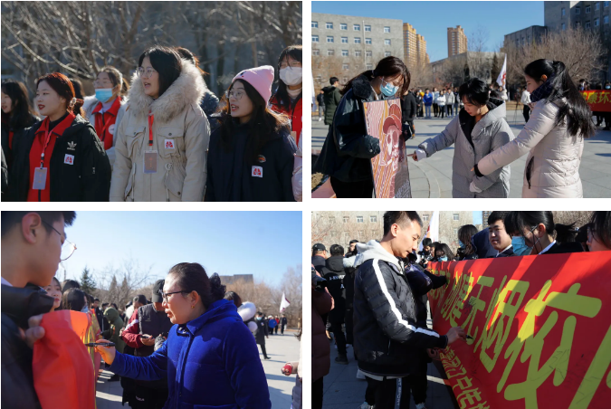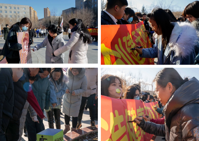 各学院领导郑重的在条幅上签字,表明建立无烟校园的决心,戒烟志愿者也纷纷响应禁烟的号召,将自己手中的香烟主动放入香烟投放处。在此校团委呼吁大家要加强自我意识、认识到吸烟的危害、坚决抵制烟草的诱惑、做到不吸一手烟,远离二手烟。