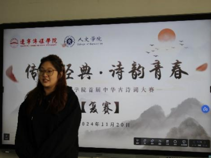 为传承古典文化精髓、弘扬传统文化价值观,同时极大地丰富本校学生人文内涵、增强文化自信,由人文学院承办的传承经典·诗韵青春为主题首届中华古诗词大赛于2024年11月20日13:30在人文楼408教室成功举办。