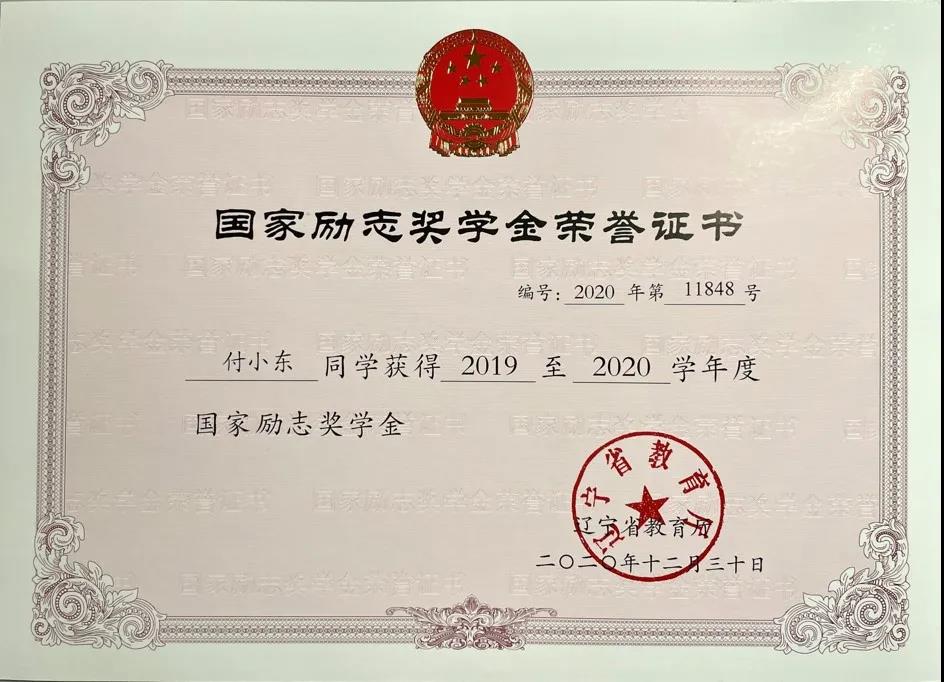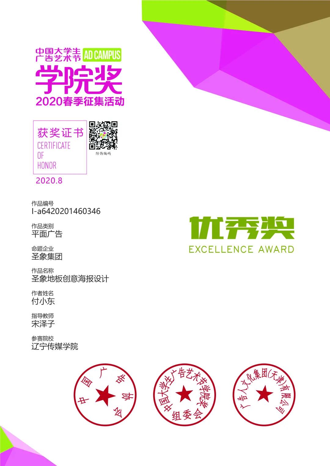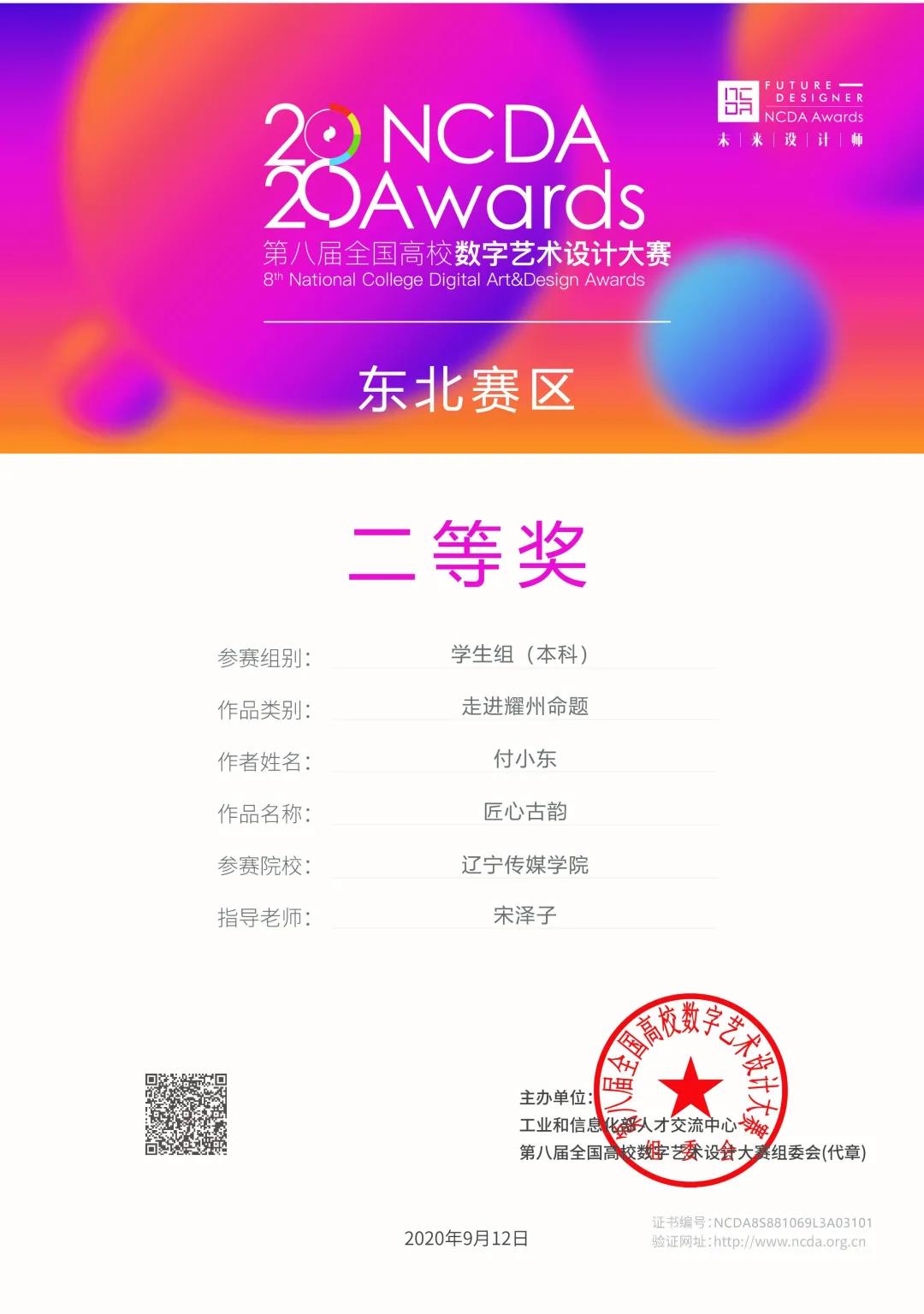 付小东同学在校期间学习成绩优异,综合成绩突出,具有较强的创新科研精神、团队合作精神和青年担当精神。大学期间参加了辽宁省人文社科论文挑战杯大赛、大学生创新创业大赛、央广网公益广播稿征文大赛、沈阳市高校大学生摄影大赛、太阳成集团官方网站三十周年校庆征文活动及太阳成集团官方网站北校区道路命名征文活动。曾获校级、市级优秀共青团员等先进个人荣誉称号;2019至2020学年度国家励志奖学金;第八届全国高校数字艺术设计大赛二等奖、中国大学生广告艺术节第16届春季赛佳作奖、学院奖2020春季征集活动优秀奖;学位论文入选本科优秀论文集。
