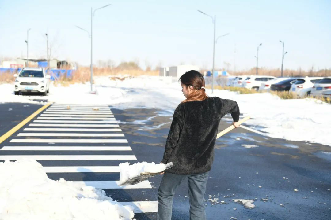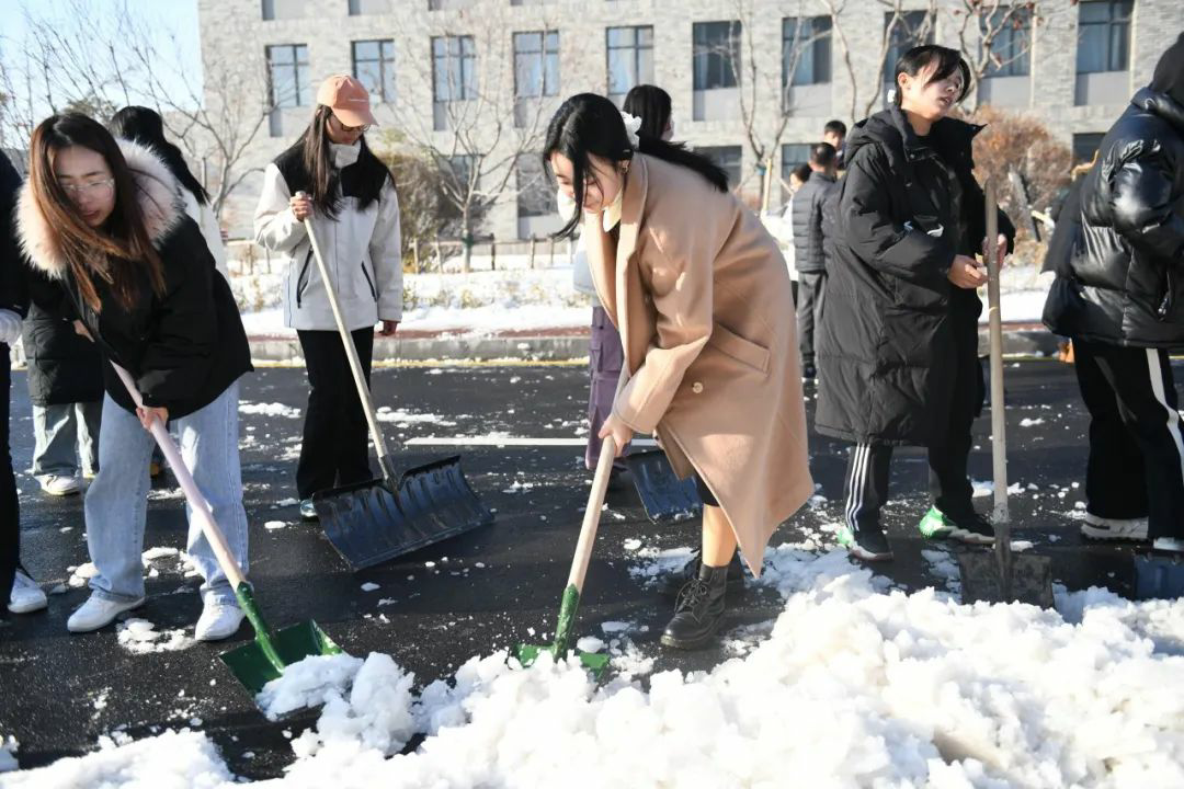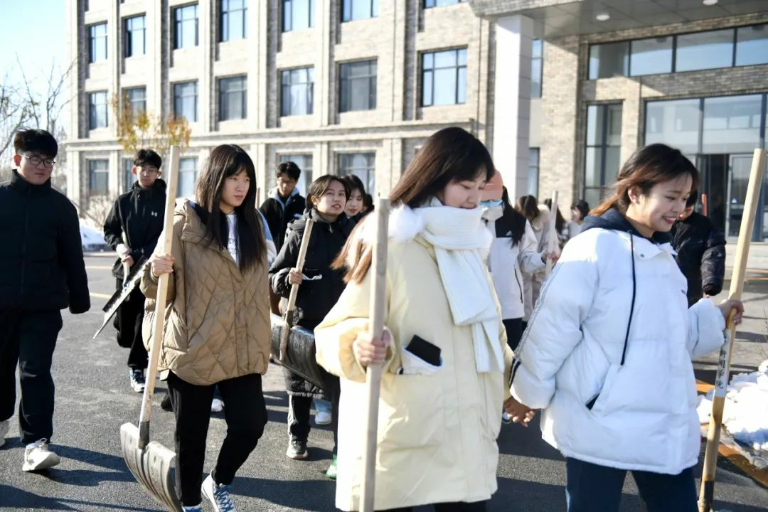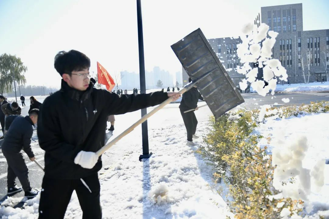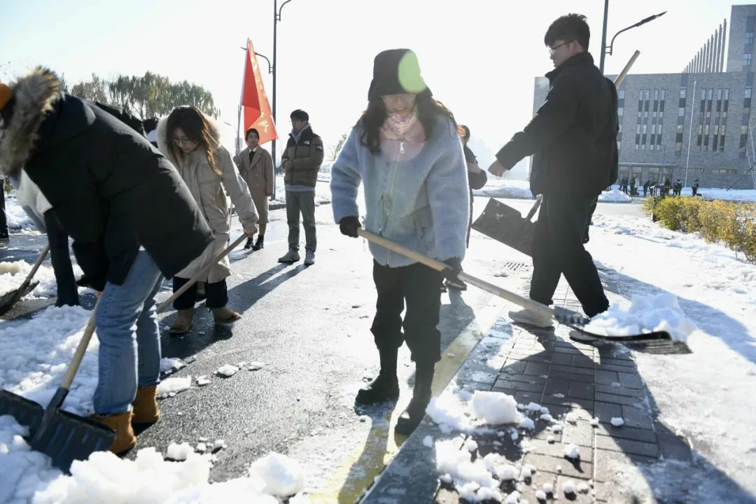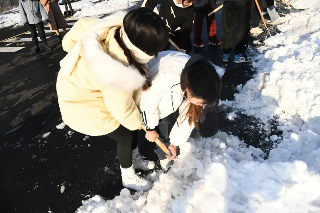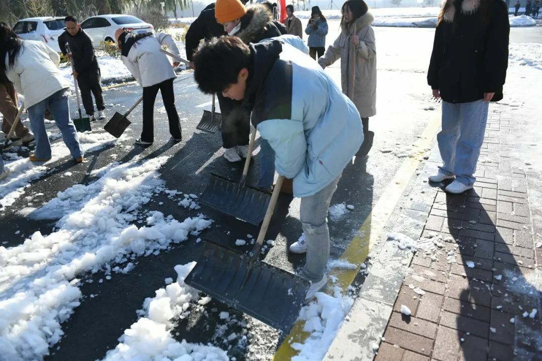 扫雪铲冰工作,分工明确,手持清雪工具,相互配合,全力清除教学楼及周边道路的积雪和暗冰。低温环境使路面结冰让清扫工作变得相对困难,寒风凛冽,但这丝毫不影响师生们的劳动热情,大家团结协作,齐心协力。