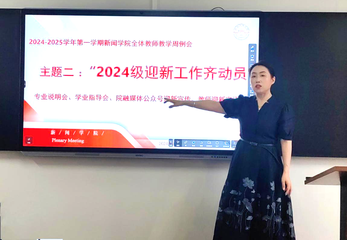 2024年9月4日下午,新闻学院在人文楼405教室召开2024-2025学年第一学期第二周教学周例会,围绕“新闻学院成立教授委员会、2024级迎新工作、2021级定制培养班开班暨校企合作共同体建设启动仪式”等三项主题铺开工作布署。学院班子统筹规划,目标明确,聚力谋远;教师队伍戮力同心,乘势而上,步履坚定。会议由新闻学院副院长张潇予主持,系主任毛思泽、王旭、黄斯杨、李鹏飞及全体教师参会。