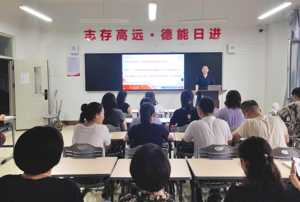 随后,张潇予副院长介绍了本周即将启动的2024级迎新工作,强调迎新工作主要围绕四项具体任务展开:一是各系部要精心设计专业说明会,进一步帮助新生了解专业概况、专业特色、课程设置及就业前景,增强新生专业认同感和向学力;二是学业指导教师工作要提前展开、提早介入,为新生提供学习方法和学习规划指引,帮助新生端正学风,尽快适应大学生活;三是全院教师要积极投身学院迎新工作,参与宣传,积极推送迎新活动、学院动态及新生关注的相关信息,提升学院影响力和凝聚力;四是要求每位教师精心准备迎新寄语,真诚地给予新生精神上的鼓励和支持,增强他们的归属感和自信心。